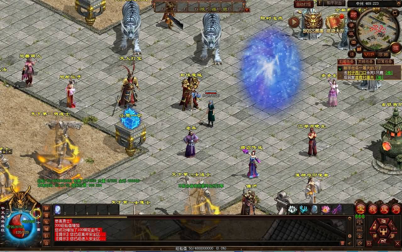 11:新增经典、时光区、灵枪时装系统,新增怪物爆率透视功能,更新套装技能道士召唤碧血魔,完善虎王和龙王脚本和物品。